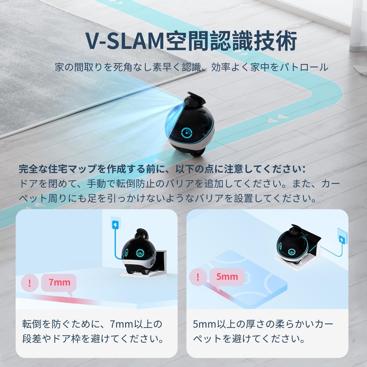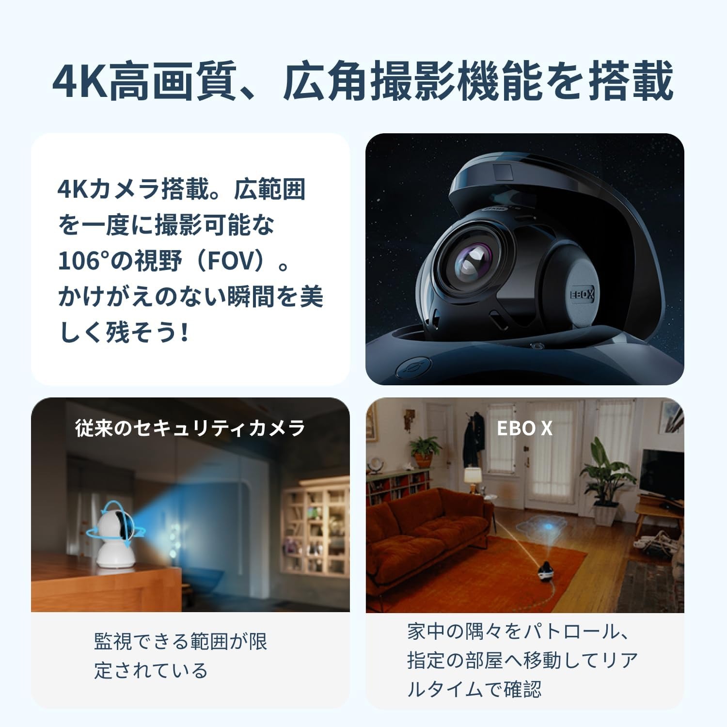 【スマートホーム3-in-1ロボット】:EBO Xは、ご自宅でのスマートなガーディアンとなります。高齢者の転倒アラート、泣き声・助けを呼ぶアラート、登りのアラート、顔認識・服薬リマインダー、見知らぬ人アラート、固定位置・自動巡回セキュリティなど、さまざまな機能を備えています。スマートマッピングとV-SLAMナビゲーションにより、EBO Xはより正確に家中を移動できます。安定化された4K 8MPセキュリティカメラは、低照明環境でも部屋を監視することができます。Harmanのカスタマイズスピーカーでプレミアムな音をお楽しみください。