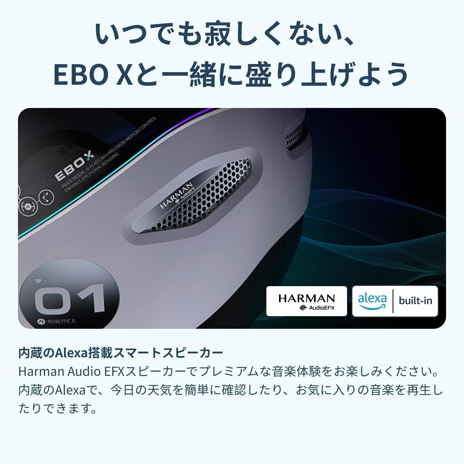 【家族と一緒に遊ぶ】:EBO XロボットにはAlexaが内蔵されており、Amazon Alexaと会話し、スマートホームデバイスを制御することができます。アプリ、音声、タッチの3つの方法でロボットを制御でき、ライトのカスタマイズも可能です。音楽を再生すると、ダイナミックなライティングが曲のリズムに合わせて変化します。